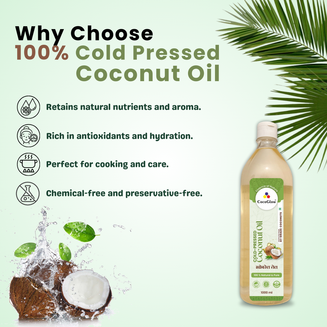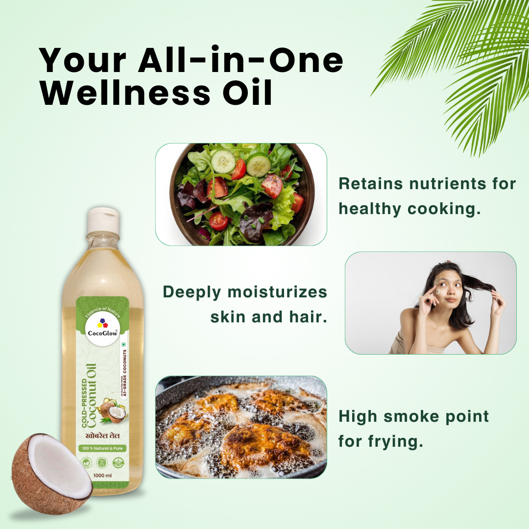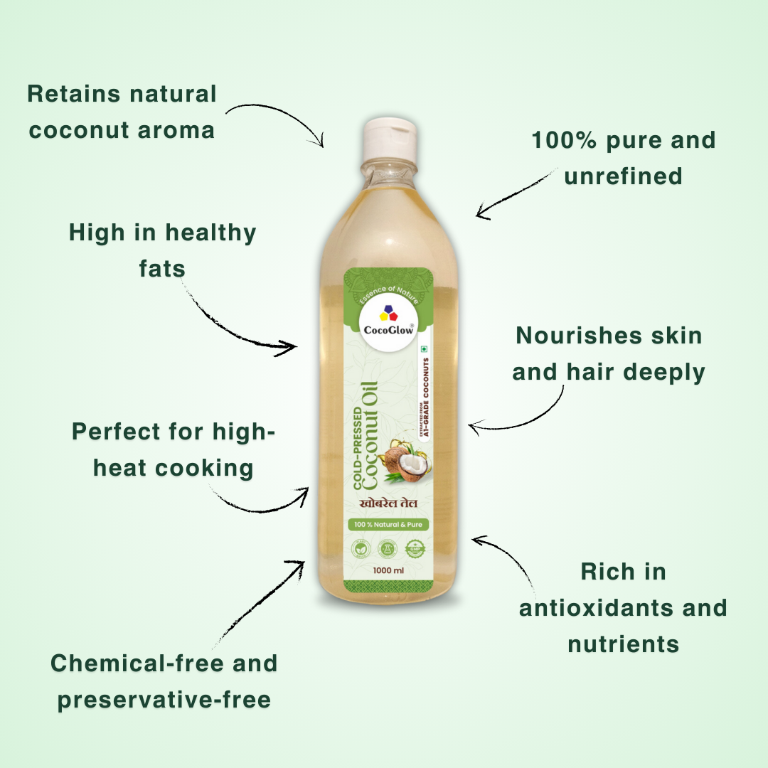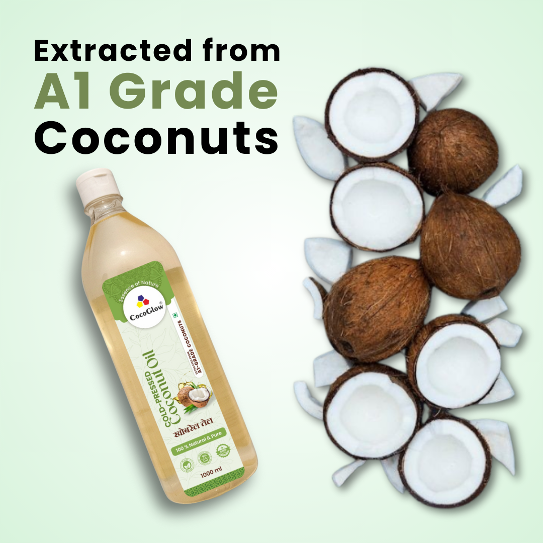 CocoGlow Cold-Pressed Coconut Oil is carefully extracted from fresh, mature coconuts